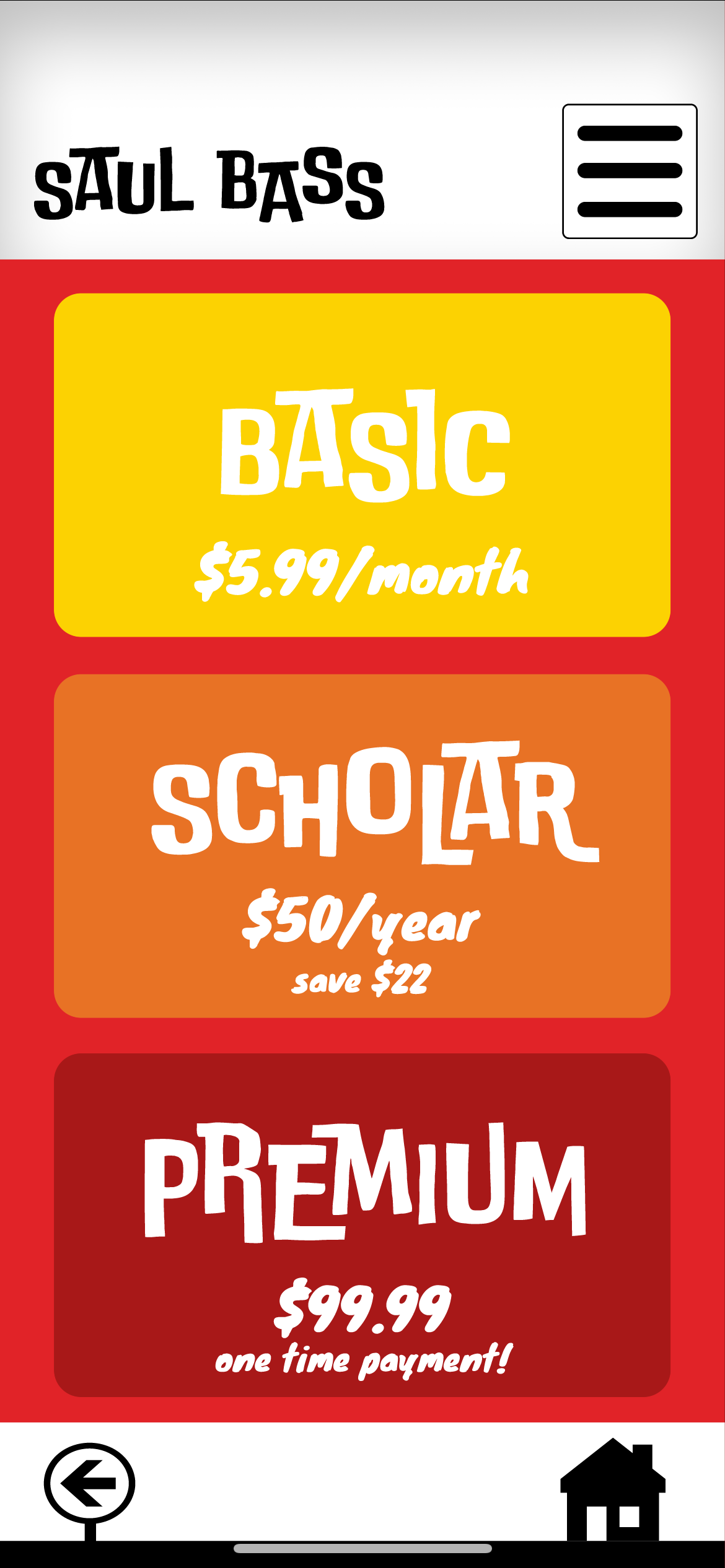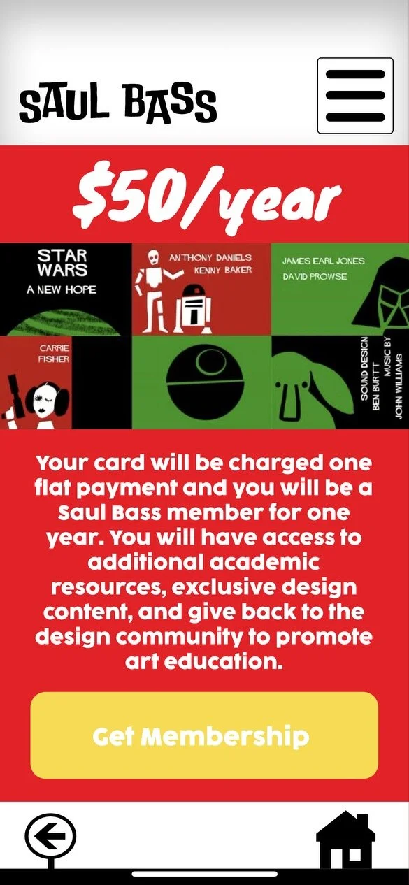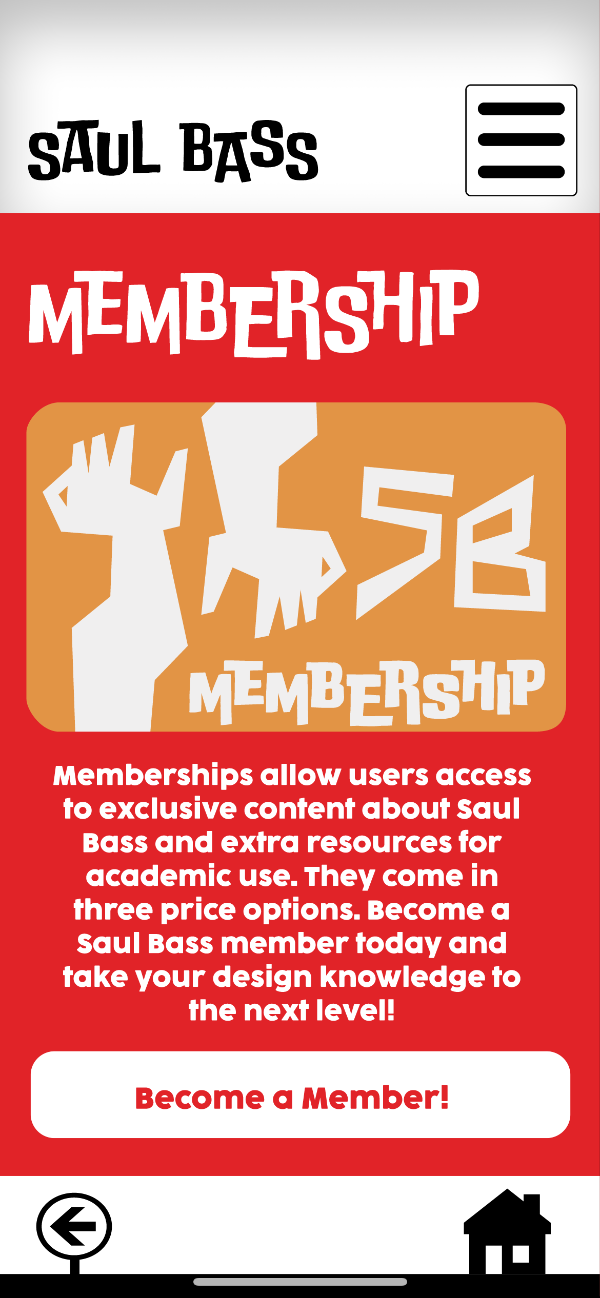 Saul Bass Educational App An app to educate young art students on the iconic designer Saul Bass. Figma 2024 App Logo (click to view video or click arros to go through screens of task) Task: Buy $50/year membership Your account Membership information Different memberships Description of $50/year membership Apple Pay screen Check out Slide 1 Slide 1 (current slide) Slide 2 Slide 2 (current slide) Slide 3 Slide 3 (current slide) Slide 4 Slide 4 (current slide) Slide 5 Slide 5 (current slide) Slide 6 Slide 6 (current slide) Slide 7 Slide 7 (current slide) Slide 8 Slide 8 (current slide)